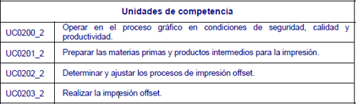 La formación teórica se realizará a través de módulos y aprobando todos los módulos se obtendrá el CERTIFICADO DE PROFESIONALIDAD. Las competencias adquiridas por el alumnado será: "Realizar la impresión por el procedimiento offset hoja, preparando y ajustando los elementos del proceso de impresión y las materias primas necesarias, según la productividad y calidad establecidas e interviniendo en el proceso gráfico, teniendo en cuenta la normativa de seguridad, salud y medio ambiente".